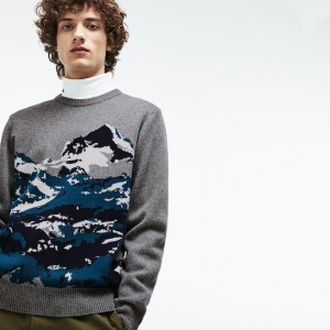Men's Lacoste Grey / Green / Blue / White Sweaters Crew Neck Alpine Print Wool And Cotton Jacquard NV1-81808R2