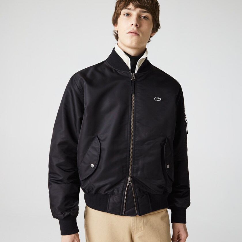 Bring out your trendy side with this oversized zippered bomber jacket in lightweight taffeta and slightly padded. Crafted in a solid colour, it also stands out for the oversized felt badge on the back. Highly functional thanks to the two flap pockets on the sides and the contrast zippered pocket on the left sleeve. Slip into a pair of jeans from the collection to get your city look on. Large size model. We advise women to choose the size below their usual size.