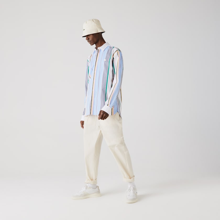 Men's Lacoste Blue / White Shirts LIVE Relaxed Fit Mismatched-Stripe Cotton EJ3-44284F3