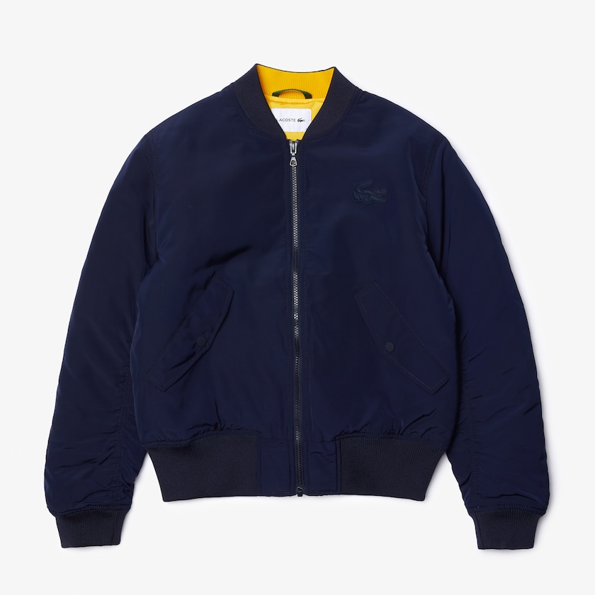 Emblematic sportswear flair dominates this solid zippered bomber jacket. Water-resistant quilted taffeta crafting, this new must-have is enhanced with contrast lining, tone-on-tone finishes and a silicone crocodile on the chest. Flap pockets with snap fastenings complete this go-everywhere piece.